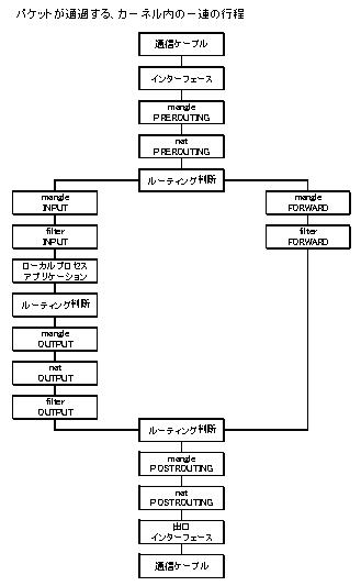 機能 パケットフィルタリング IPフィルタリング ステート機構 マッチ チェーン ジャンプとターゲット ターゲット コマンド コマンドオプション PFフレームワーク 構成 PFフレームワーク 3組込み型テーブル nat テーブル mangle テーブル filter テーブル ターゲット conntrackエントリ モジュール 動作 ルーティング一般 PFフレームワーク カーネル内工程図 INPUT OUTPUT FORWARD コネクション追跡 TCPステート処理 用語 ルール設定 スクリプトの構造 サンプルNW サンプルスクリプト |